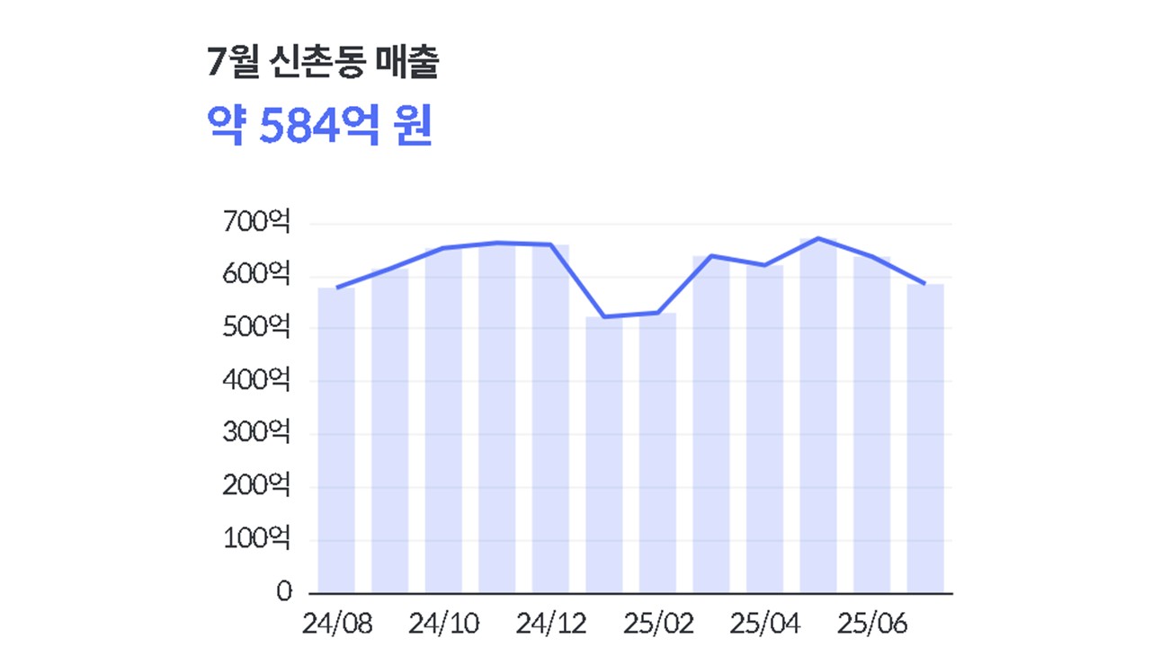 통계청과 서울시가 공개한 자료에 따르면, 신촌동 상권에 월매출은 크게 변동하는 것 같진 않아 보여요. 방학 기간을 제외하고는 신촌동 상권의 월 매출액은 평균 500억 원 중후반대로 일정 수준의 매출을 기록하고 있죠.