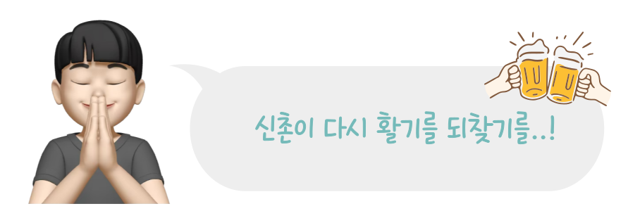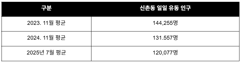별다른 축제가 없더라도 신촌은 대표적인 🎓대학가로 유명하죠. 여러 대학이 밀집해있는 신촌 상권의 평소 모습은 어떨까요? 항상 사람들로 붐볐던 🍻옛 모습과 달리 신촌은 지금 힘든 시기를 겪고 있어요.😔 한국부동산원의 발표에 따르면 2025년 2분기 신촌·이대 상권의 🏚️공실률*은 약 11.3%에 해당한다고 합니다. 같은 기간, 서울 전체 지역의 공실률이 8.6%라는 점을 감안하면 더 이상 활발한 상권이라고 보기는 어려울 것 같아요.🚫